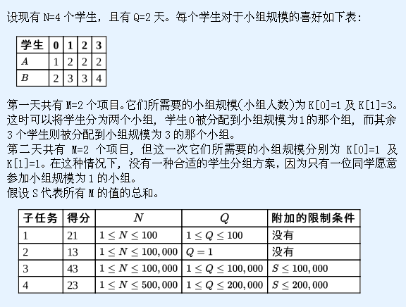 给定对所有学生的描述:N,A及B,同时也给定了Q个问题的序列 — 每天一个问题。每个问题包含当天要完成的M个项目, 同时含有一个长度为M的序列K, K[i]表示项目i所需的小组规模。