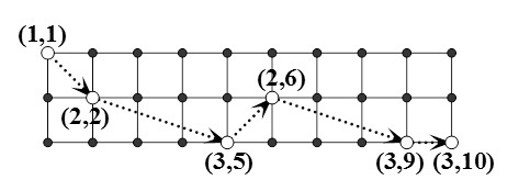 现有一个n行m列的棋盘,一只马欲从棋盘的左上角跳到右下角。每一步它向右跳奇数列,且跳到本行或相邻行。跳越期间,马不能离开棋盘。例如,当n = 3, m = 10时,下图是一种可行的跳法。