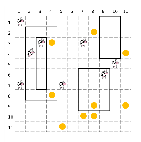 一个10^6行10^6列的网格图,上面有一些牛、花和一些矩形围栏,围栏在格子的边界上,牛和花在格子里,牛只能向下或向右走,牛也不能穿过围栏和地图边界,求每头牛它能到达的花的数量。注意栅栏不会相交