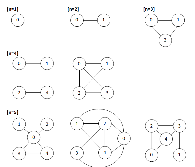 两个零件即使仅有标号不同也被视为不同的零件。为了帮助你理解问题,SHTSC特地给了你顶点数<=5的零件的图例。