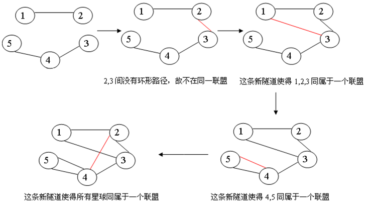 新轨道建成后,可能会使一些星球属于同一个联盟。你的任务是计算出,在一条新隧道建设完毕后,判断这条新轨